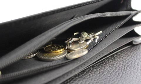 z poręcznym ładnym uchwytem, - Kieszeń na monety jest wykonana w taki sposób, że nie ma prześwitów w dolnych rogach - co zapobiega gubieniu zawartości; kieszeń odchyla się na tyle daleko, że nie ma problemów z wyciąganiem bilonu; zawartość jest doskonale widoczna,
